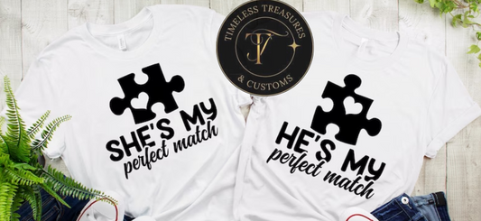 "Puzzle Pieces of Love: "He's My She's My Perfect Match" T-shirt – Wear Your Connection with Pride!"