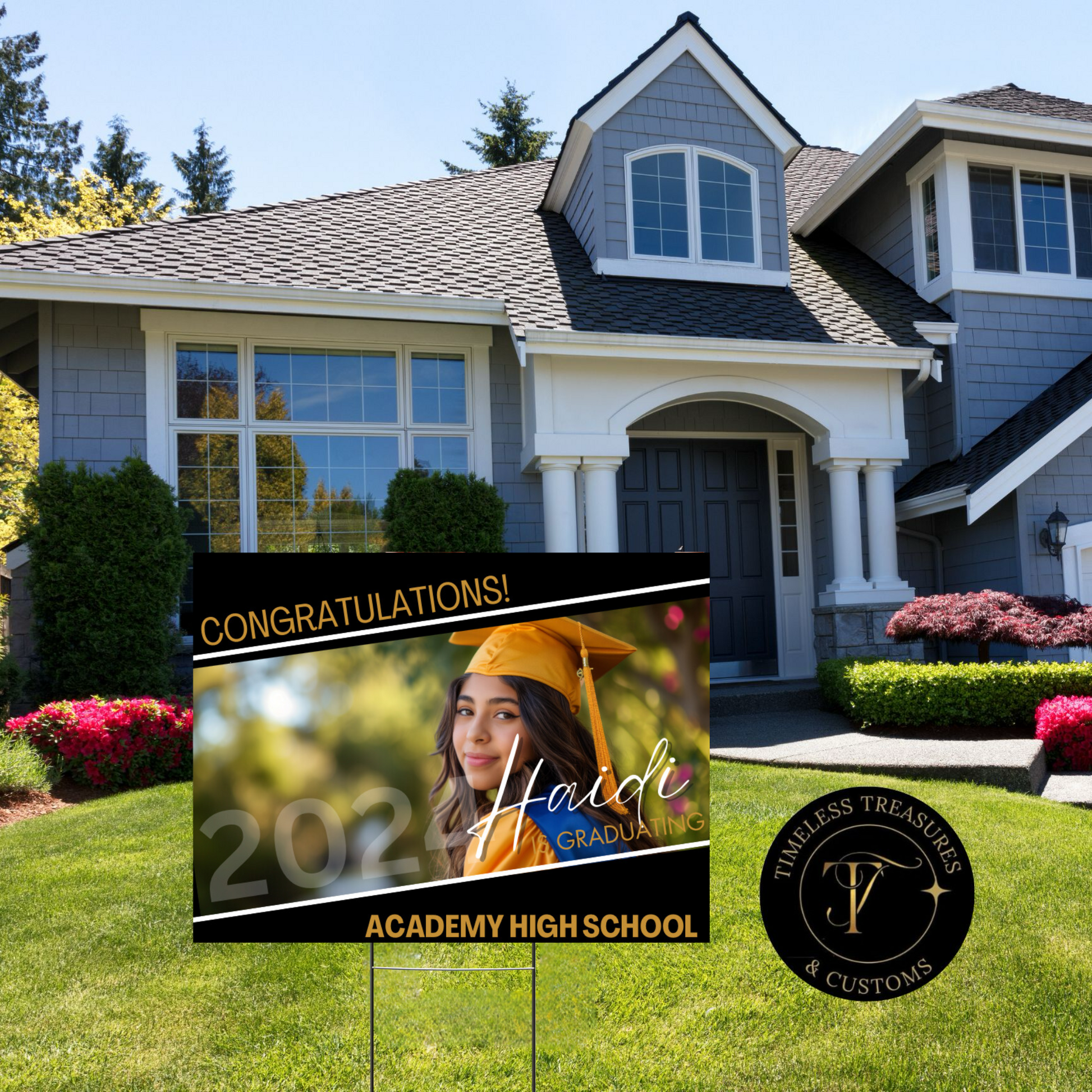 Celebrate your graduate's success with our Custom Graduation Yard Sign! Personalize it with their name, photo, and graduation details for a standout tribute in your yard. Sturdy and weather-resistant, this sign is a stylish way to share the joy with the whole neighborhood. Mark this milestone with pride and let the world know your graduate is ready to conquer new horizons! 🎓🏡